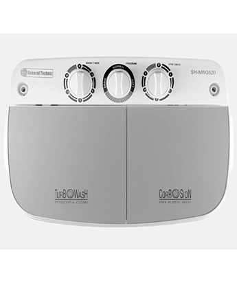 مینی واش جنرال تکنیک مدل SH-MW 3820 یک ماشین لباسشویی دو مخزن است که یک مخزن برای شست و شوی البسه و مخزن دیگری برای خشک کردن لباسها دارد. این مینی واش دارای دو ورودی مجزای آب جهت آبگیری و آبکشی لباسها در مخازن شستشو و خشک کن است. همچنین این مدل دارای دو موتور مجزا جهت عملکرد همزمان سیستم شستشو و خشک ک نیز است. از نظر ابعاد نیز دارای اندازهای بسیار جمعوجور و مناسب است که در یک مکان کوچک نیز به راحتی جا میشود. ظرفیت دیگ این مینی واش 3.8 کیلوگرم است که این عدد نشاندهنده آن است که باید مخزن ماشین را با البسه بسیار کم و محدود پر کرد زیرا اضافه کردن لباس بیش از حد به موتور آن صدمه وارد میکند و در بلند مدت سبب خراب شدن آن میشود. همچنین مینی واش جنرال تکنیک مدل SH-MW 3820 مجهز به سیستم آبکشی شرعی یا اسلامی است.